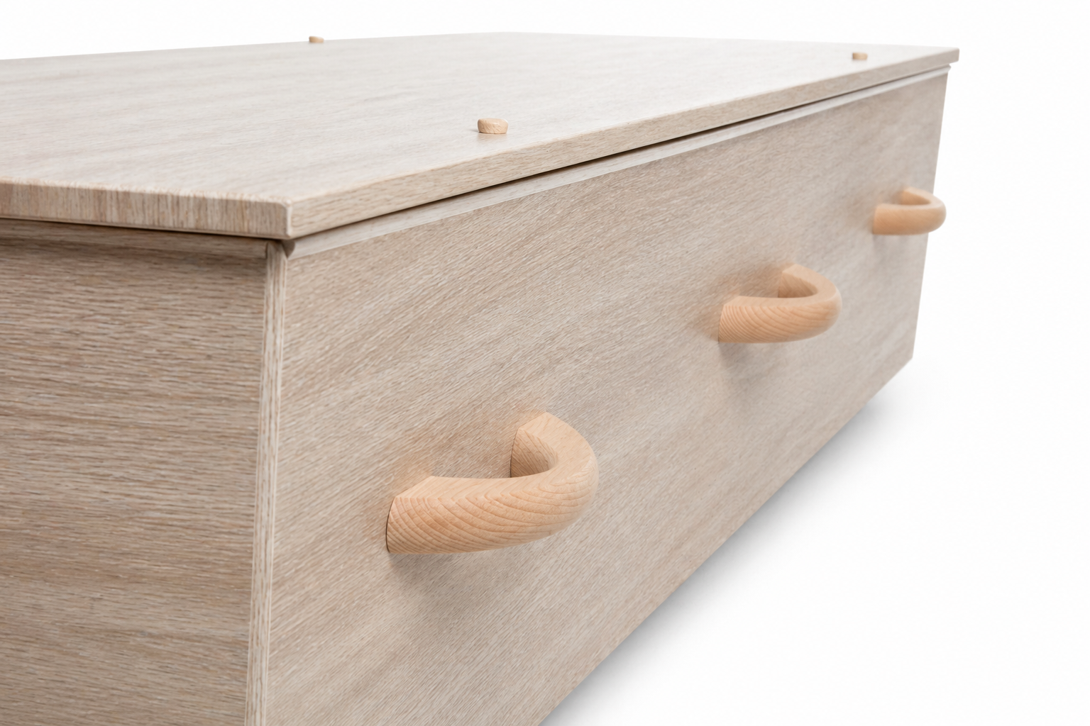 De kist heeft acht handgrepen in de kistkleur en bamboe sluitpennen passend bij de uitstraling van de kist.